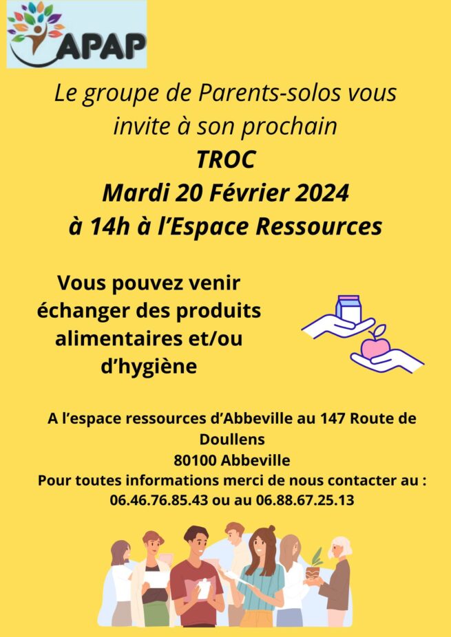 Abbeville– Espace ressources A vos agendas, Les Parents-solos vous invitent à venir participer à leur Troc ! Venez nombreux !